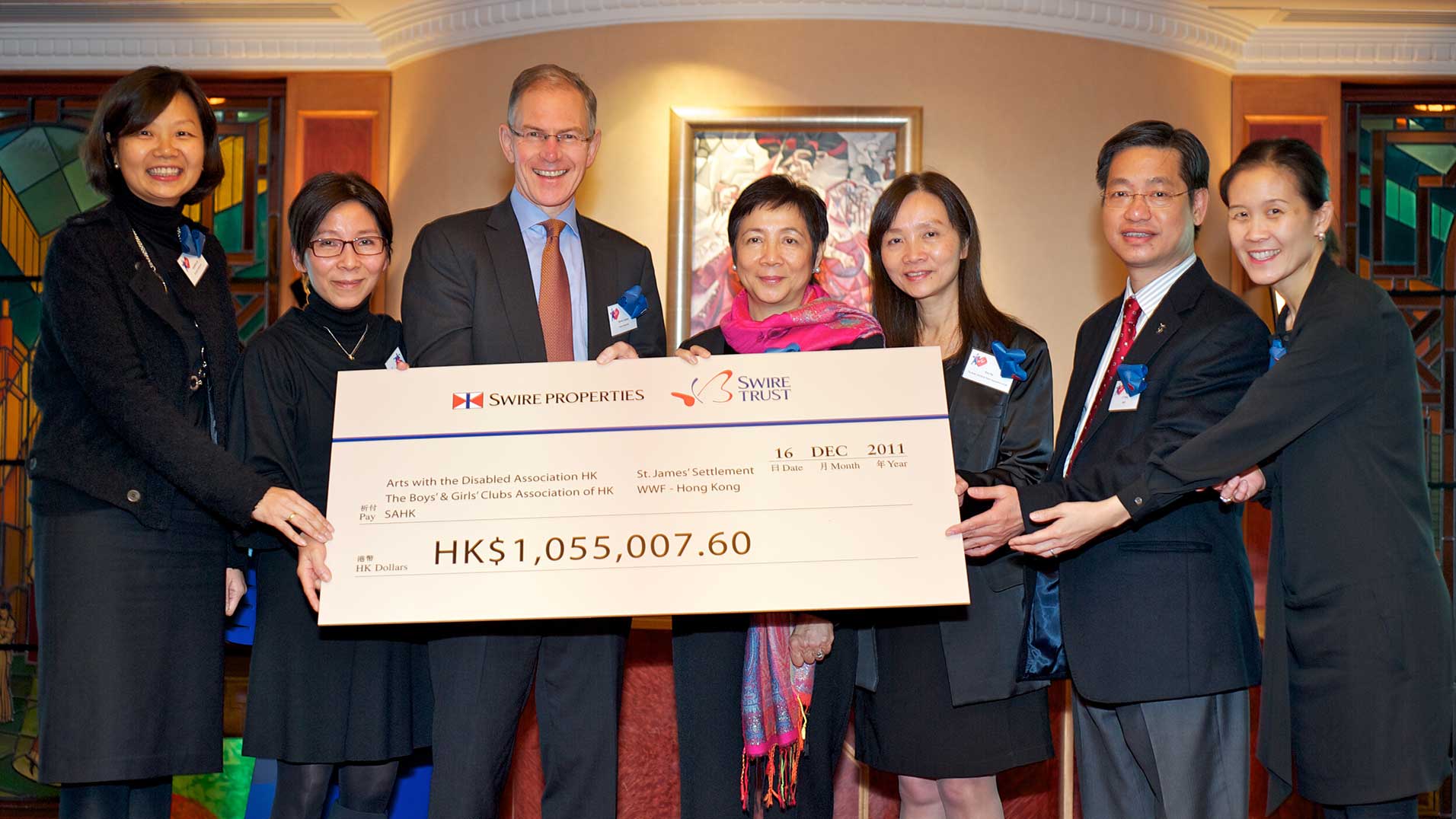 A Thank You Drinks and Cheque Presentation ceremony was held to thank the Community Ambassadors and everyone involved in the event for their generous support. Martin Cubbon, Swire Properties’ Chief Executive and Maisie Shun Wah, representative of the Swire Group Charitable Trust, handed over the cheque to representatives of the five NGOs who co-organised the event — Arts with the Disabled Association Hong Kong, The Boys’ and Girls’ Clubs Association of Hong Kong, SAHK, St. James’ Settlement and WWF-Hong Kong. The funds raised will be used to help support the community development work of these five organisations.