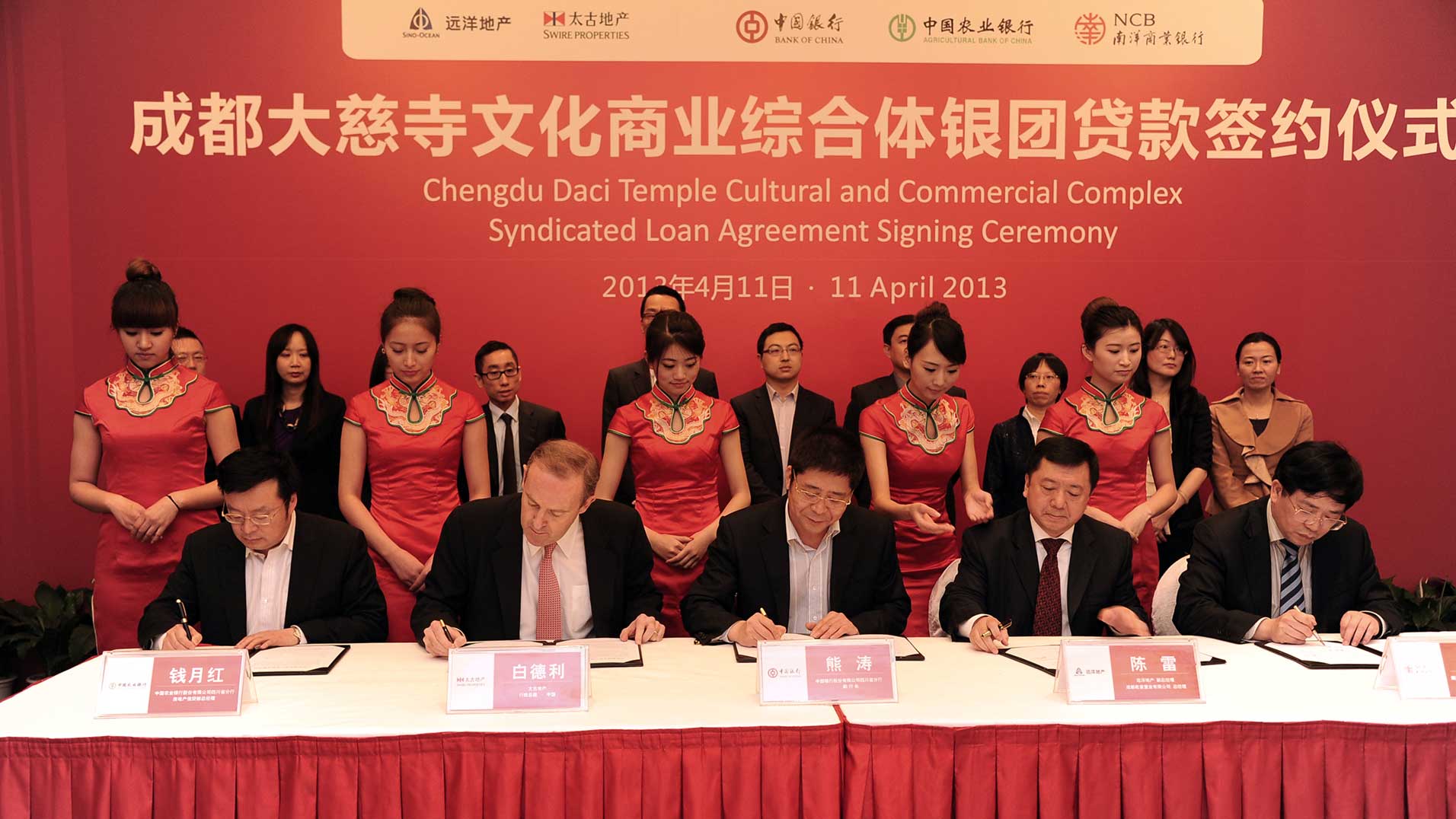 Sino-Ocean Land and Swire Properties yesterday jointly announced that they have entered into an agreement for a RMB2.25 billion syndicated loan with Bank of China Limited, Agricultural Bank of China Limited and Nanyang Commercial Bank (China) Limited for their joint-venture companies, Chengdu Qianhao Real Estate Company Limited (“Chengdu Qianhao”) and Chengdu Yingang Real Estate Company Limited. The RMB2.25 billion 10-year syndicated loan will provide funds for use in the development of the Chengdu Daci Temple Cultural and Commercial Complex. An official signing ceremony was held in Chengdu yesterday to mark the agreement.