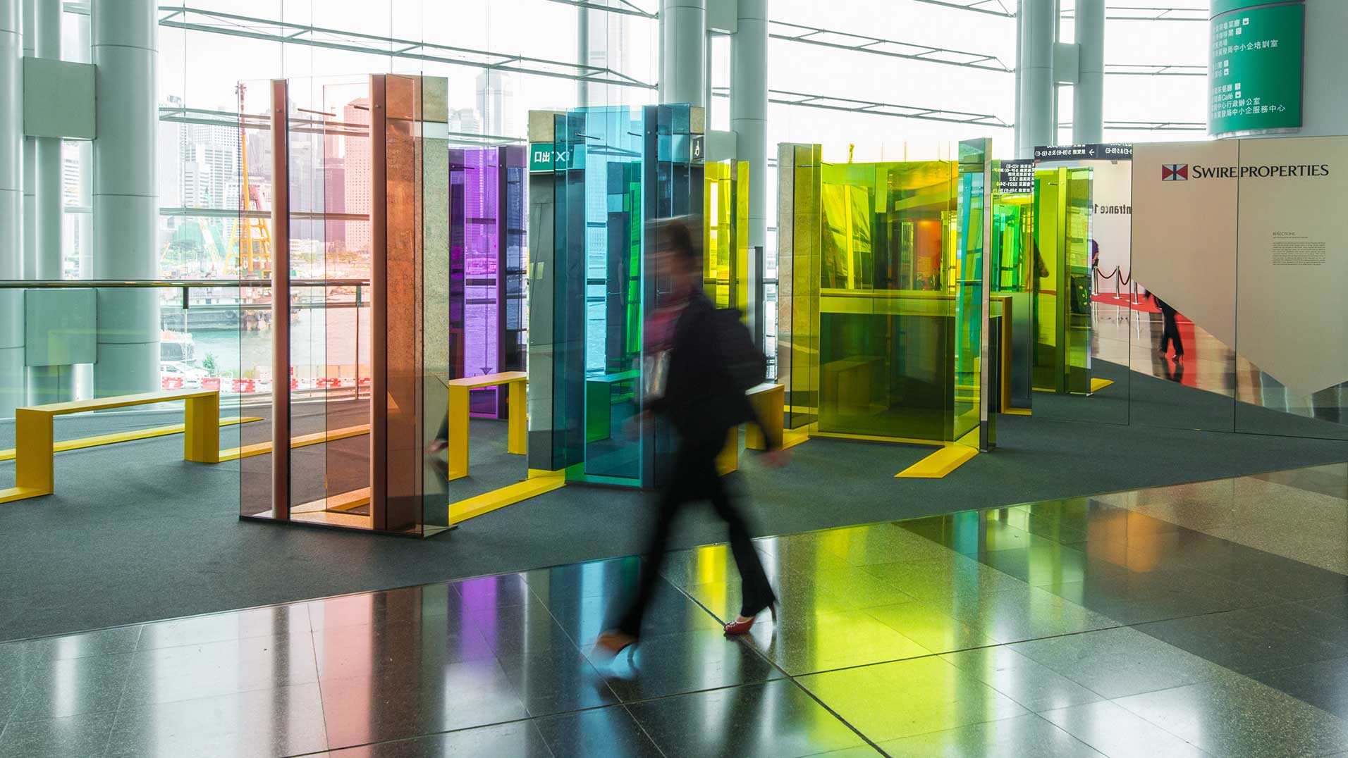 Echoing Swire Properties’ belief in creative transformation, the design of the lounge offers a multi-layered perspective of a connected space, and attempts to surprise visitors through the use of optical illusions. The glass panels and mirrors are designed in a precise geometry and are linked by a yellow line throughout. Reflections of viewers standing on the yellow line are bounced around the installation, appearing on mirrors at unexpected corners.