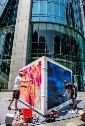 Phil Ashcroft, Xenz and Mr Jago began a live painting performance today, working on three large canvas murals brought to Taikoo Park by Swire Properties in collaboration with Aedas, architecture and design firm based in Taikoo Place. This celebration of urban art gives a rare platform to the art form in Hong Kong while bringing its vibrant and spontaneous energy into Taikoo Park. Each is the result of the artists’ unique responses to Hong Kong, which are being painted on murals composed of 40 smaller canvases (50cm x 40cm). These will be sold in an online auction to raise funds for the Hong Kong Youth Arts Foundation’s programme for disadvantaged and underprivileged youth. Live Painting performances continue on Friday 23 and Saturday 24 March, with the murals exhibited in One Island East until Tues 3 April, see details below.
