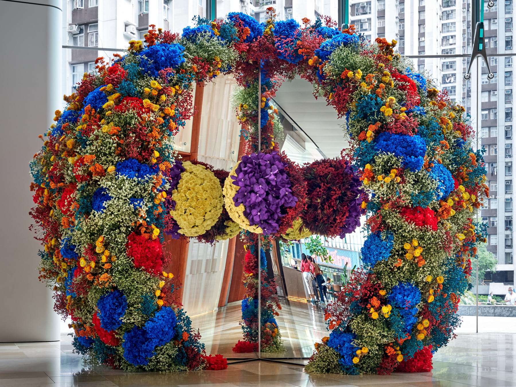 And at One Island East, “Reflections” uses a two-metre-high botanical sphere, revealing a cross-section cut out with a multi-coloured floral orb at its core surrounded by mirror reflections. The colourful flowers are reflected five times to represent five decades, symbolising the opening of a passageway to the next 50 years of innovation at Swire Properties.