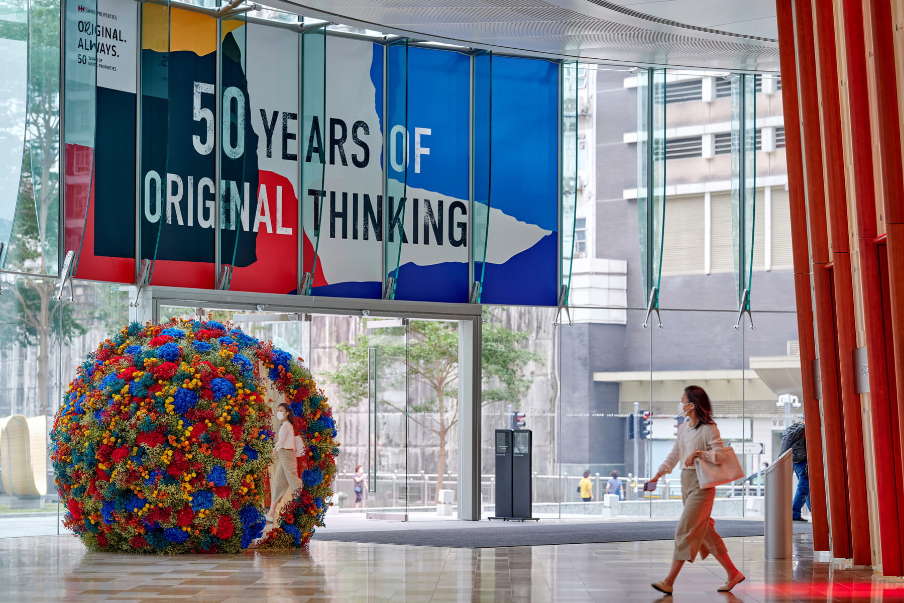 .At One Island East, “Reflections” uses a two-metre-high botanical sphere, revealing a cross-section cut out with a multi-coloured floral orb at its core surrounded by mirror reflections. The colourful flowers are reflected five times to represent five decades, symbolising the opening of a passageway to the next 50 years of innovation at Swire Properties.