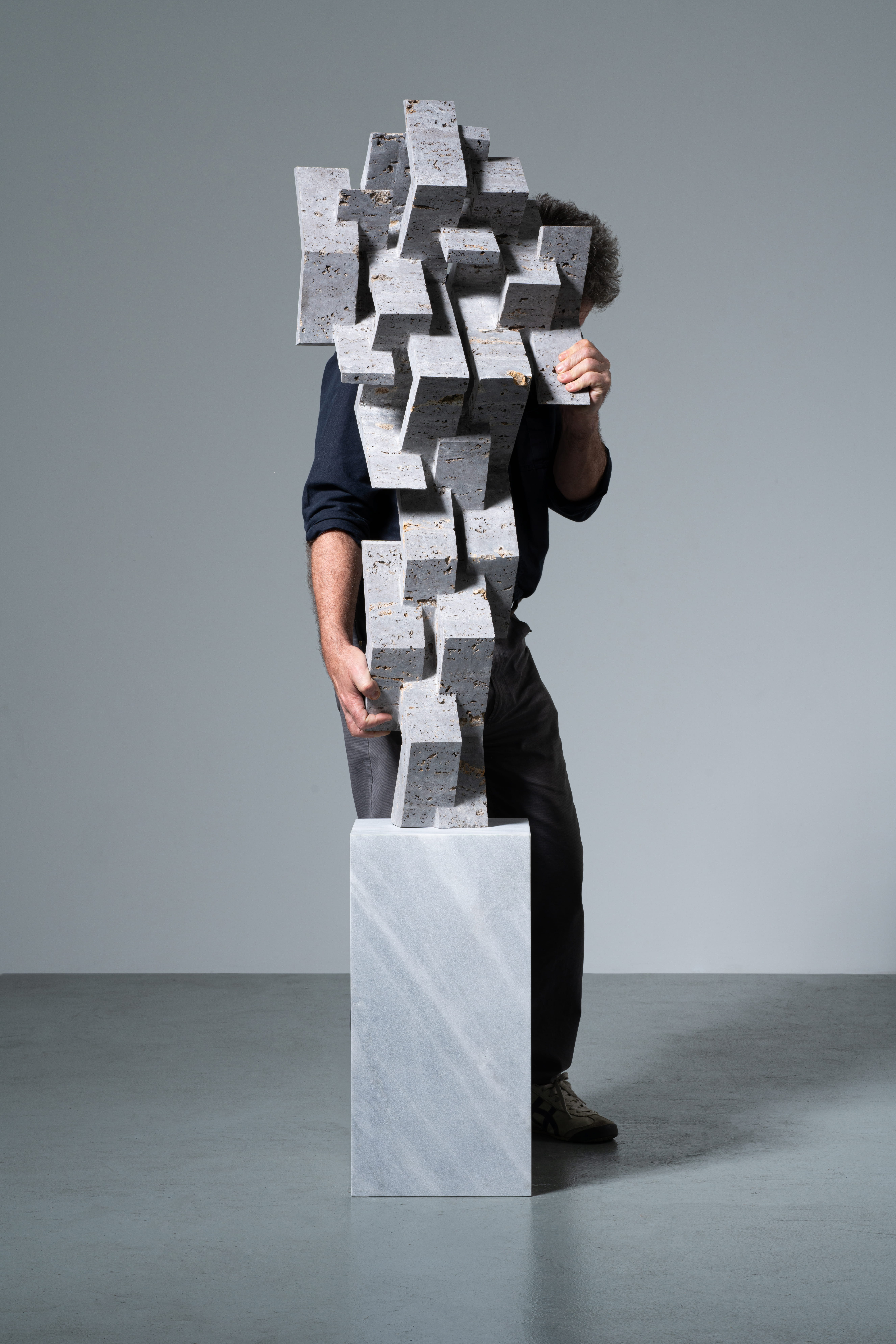 .Polo Bourieau behind his sculpture Now Here Map (2021, Titanium Travertine, 121 x 49 x 31 cm)