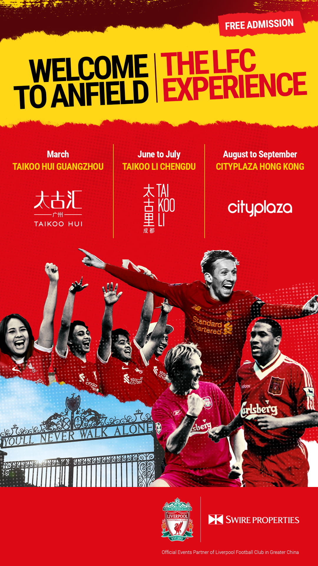 Swire Properties and the Liverpool Football Club (LFC) are teaming up for the first time ever to bring the immersive "Welcome to Anfield – The LFC Experience", at three of the Company’s shopping malls across the Chinese Mainland and Hong Kong – Taikoo Hui in Guangzhou, Taikoo Li Chengdu and Cityplaza in Hong Kong.