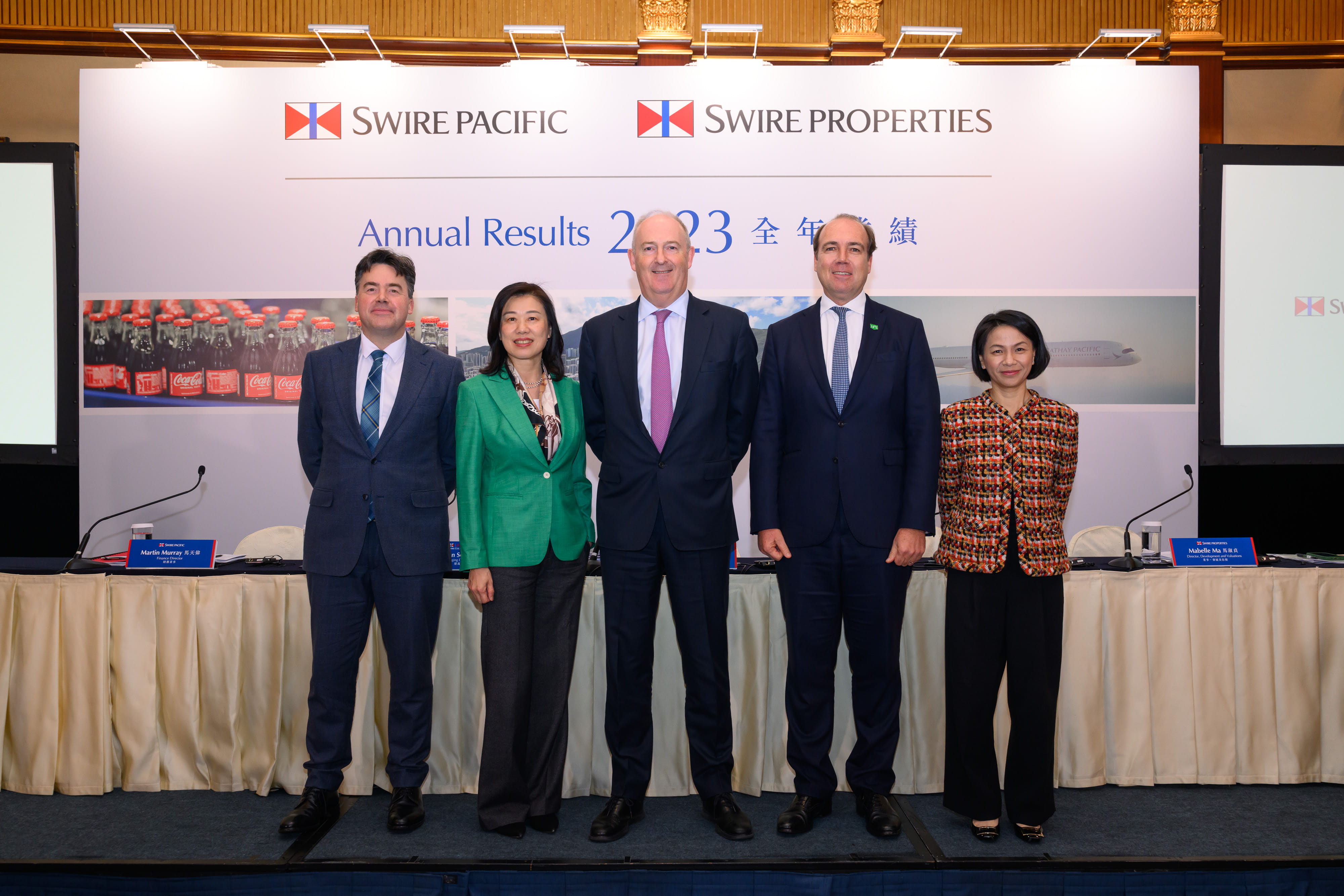 .Guy Bradley, Chairman of Swire Pacific and Swire Properties (middle), Martin Murray, Finance Director of Swire Pacific (1st left), Tim Blackburn, Chief Executive of Swire Properties (2nd right), Karen So, Managing Director of Swire Coca-Cola (2nd left), and Mabelle Ma, Director, Development and Valuations, Swire Properties (1st right).