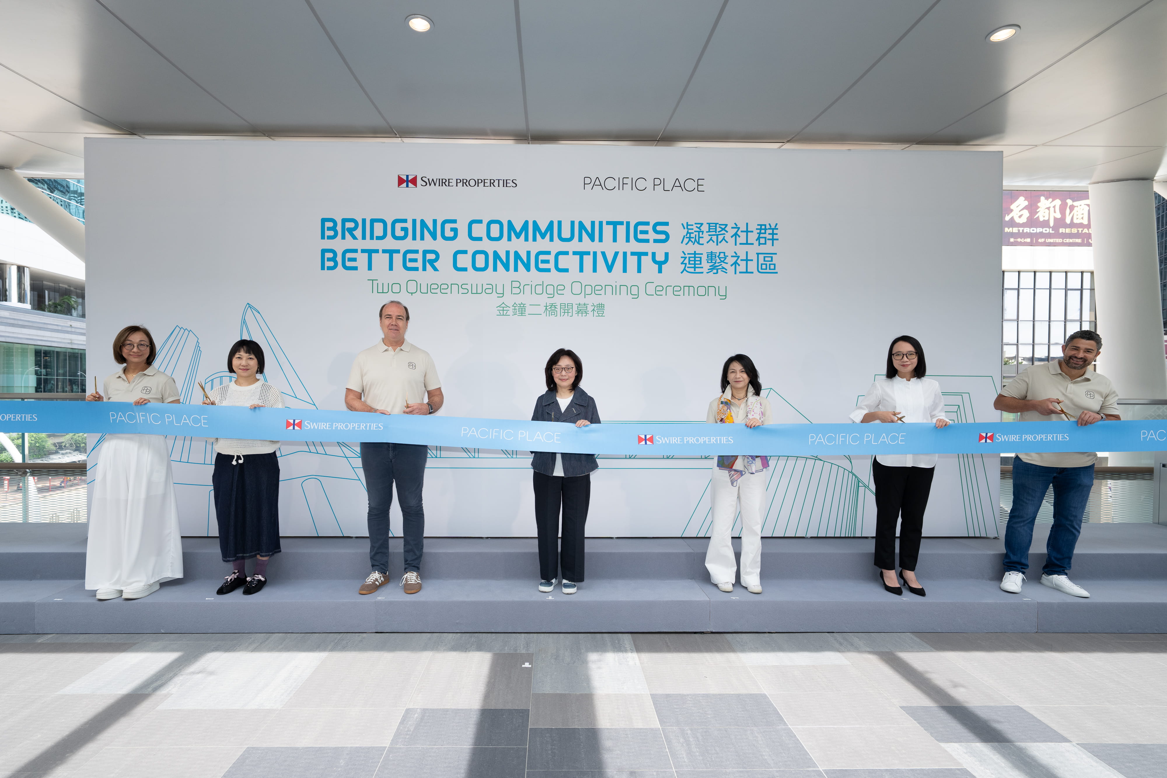 .The Honourable Bernadette Linn, Secretary for Development and Tim Blackburn, Chief Executive of Swire Properties officiated the opening ceremony of Two Queensway Bridge. The opening ceremony was attended by distinguished guests, including: Ms Mabelle Ma, Director, Development and Valuations at Swire Properties (Right 3); Miss Jeanne Cheng, District Officer for Central and Western District (Left 2); Ms Fanny Cheung, District Officer for Wan Chai District (Right 2); Mr Don Taylor, Director, Office at Swire Properties (Right 1), and Ms Wing Chiu, General Manager of Pacific Place (Left 1)