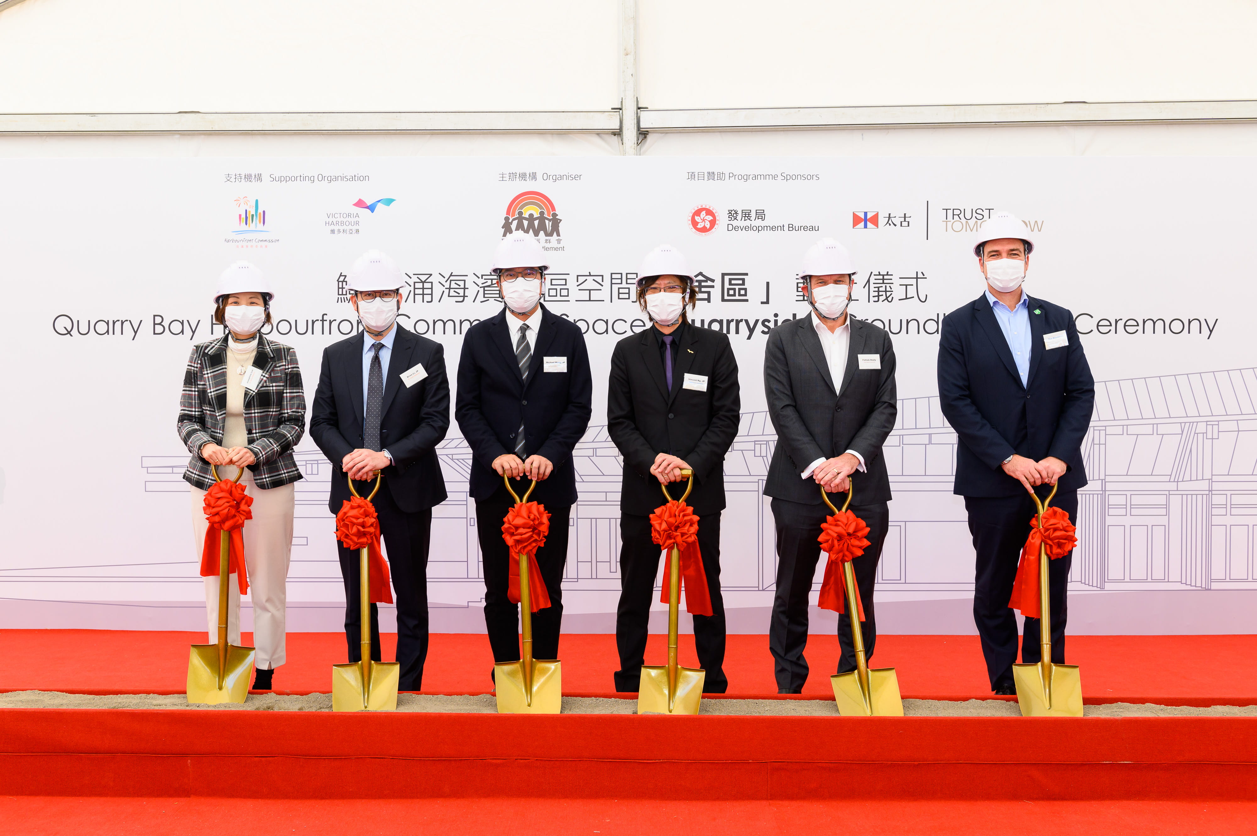.(左起) 圣雅各福群会总干事李玉芝、圣雅各福群会执行委员会副主席李民斌、发展局局长黄伟纶、海滨事务委员会主席吴永顺、太古集团慈善理事会主席贺以礼及太古地产行政总裁彭国邦今日于鲗鱼涌海滨社区休憩空间「舍区」地皮位置进行动土仪式。